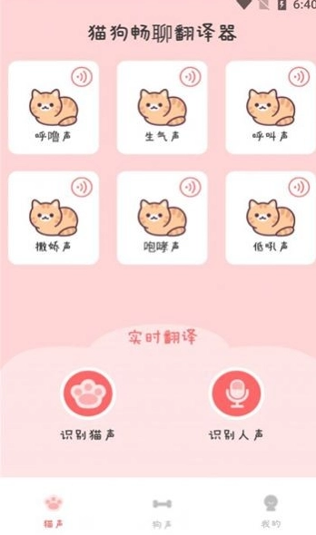 2、猫语互动界面,了猫猫日常常发出的各类语音,你还能借助界面下方的两个识别功能,实现与猫猫的沟通交流。