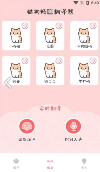 3、狗狗语音交互界面,多种狗狗日常常用的语音素材,你还能借助界面下方的两个识别功能,实现与狗狗之间的沟通交流。