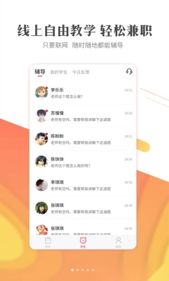 这是一个专注于学生作业辅导的家教兼职平台,采用线上自由教学模式,让兼职赚钱变得轻松便捷。只要能联网,就能随时随地开展课程辅导。平台拥有海量生源,接单从此无需担忧,更有百万中小学生在线寻求辅导帮助。