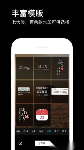 【丰富类型】特色、心情、人像、天气、地点、时间、美食,七大类百余款水印;