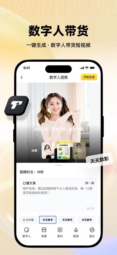 天天数影,为用户打造了海量的商品素材资源库,借助前沿的数字人混剪与溶图技术,能够便捷地创作出吸睛的带货短视频。不管你是刚入行的带货新人,还是经验丰富的带货达人,天天数影都可以助力你迅速制作出爆款视频,提高带货的效果。