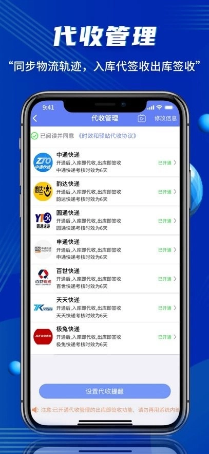 1.代收入库服务:可实现快递数据向快递公司回传,物流轨迹同步更新,货物入库即完成代收操作,出库则同步触发签收流程。