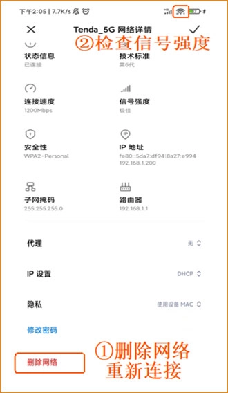 若手机连接路由器WiFi信号后无法上网,可先断开或“忘记”该WiFi,再重新连接路由器信号;其次检查手机信号是否较弱(见下图),可适当靠近路由器后再次测试能否上网。