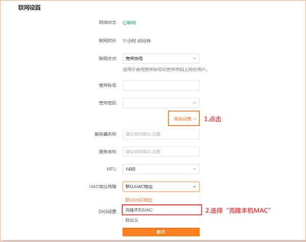 第四步:若宽带网络状态正常,路由器WAN口的信息配置也准确无误,但路由器依旧无法成功联网,建议您打开“联网设置”中的“高级设置”,找到“MAC地址克隆”选项,选择“克隆本机MAC”后重新尝试连接,稍作等待几分钟,查看是否能够成功联网。