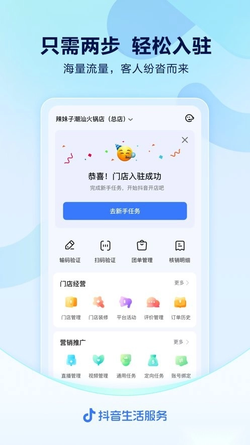 【抖音来客】作为抖音本地生活商家专属服务平台,商家入驻后即可使用门店信息管理、团购商品上架、营销活动推广、经营账款结算等一站式功能。借助抖音海量用户流量优势,助力商家轻松开展线上经营,实现收益快速增长。