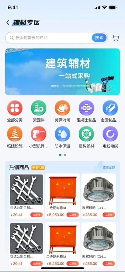平台为用户设置了商品专区分类,涵盖辅材专区、办公用品专区等商品板块。