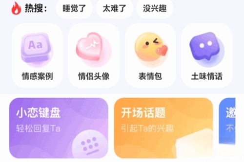 《恋小语》是南通猜猜看文化传媒有限公司打造的一站式恋爱聊天辅助软件,整合了输入法、恋爱话术、表情包、情头、土味情话等丰富功能。用户能在平台上学习各类聊天技巧,有效避免与对方陷入尬聊,还可以参考不同案例提升沟通能力。