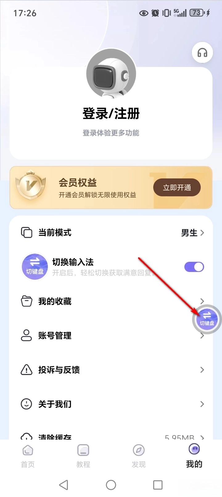 点击【我的】,再点击切换输入法后面的开关