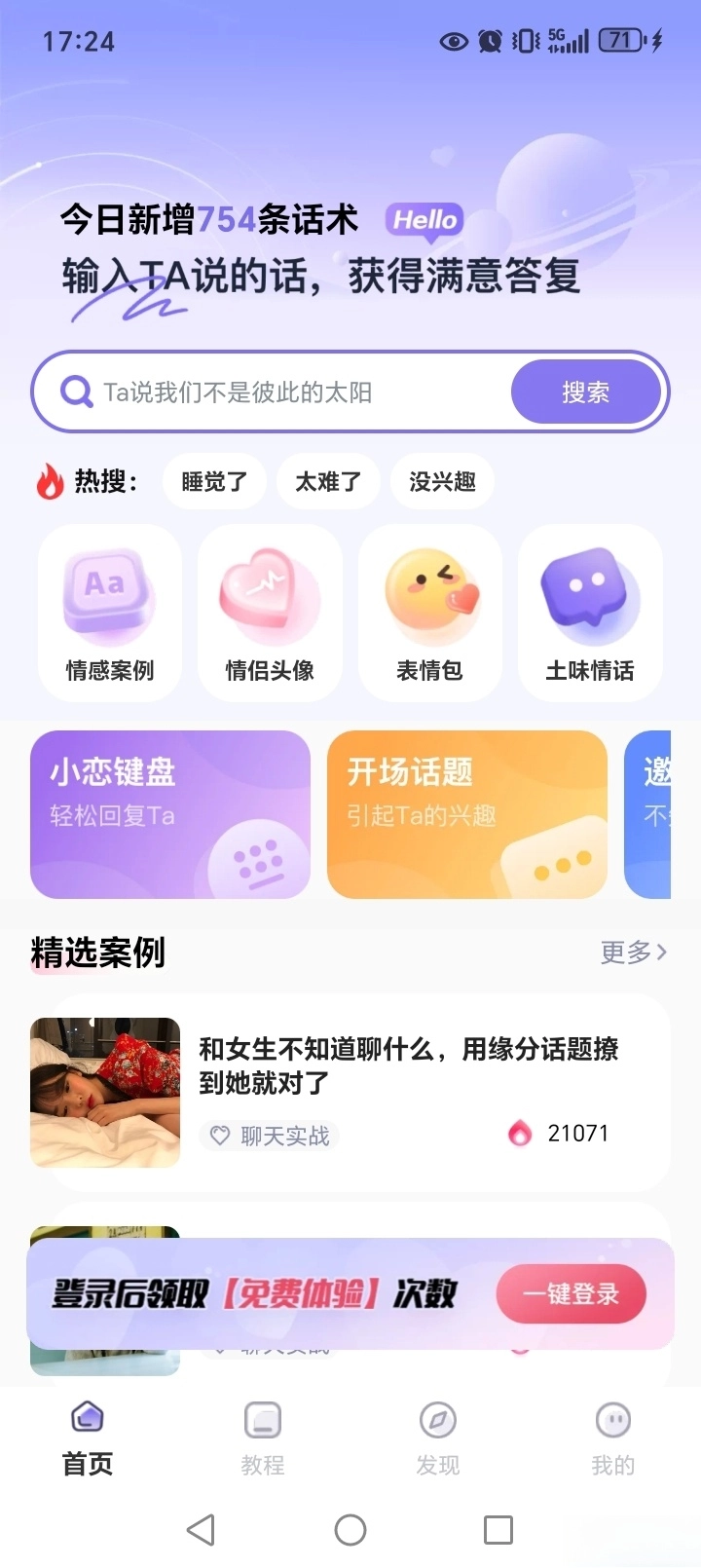 恋小语App是您恋爱社交的得力帮手。平台汇集了丰富的恋爱话术、经典表情包、精选情侣头像以及热门土味情话,能一站式满足从初识破冰到感情升温的各种表达需求。不管您是不太擅长表达,还是想寻找新鲜有趣的内容,都能在这里找到最适合的话语和素材,让每一次交流都饱含惊喜与心意。
