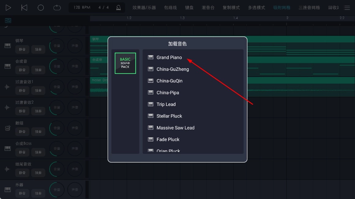 3、在加载音色的弹窗中,选择类似【Grand-Piano-音色】这样的选项来完成加载操作。