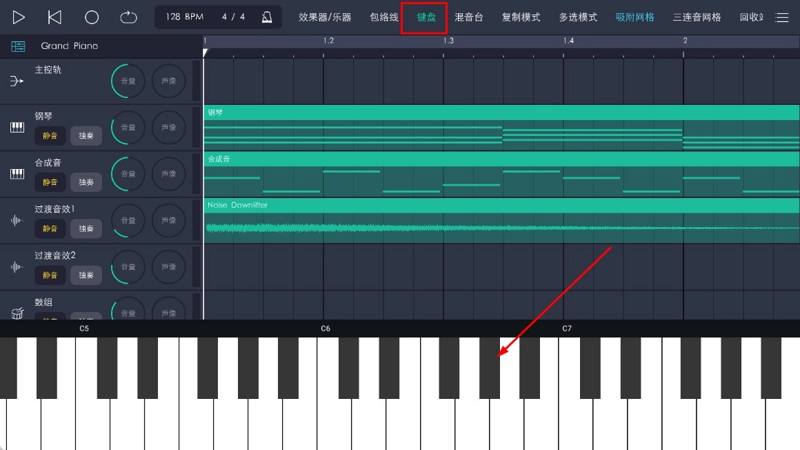 4、点击顶部的【键盘-功能按钮】,此时会弹出虚拟钢琴键盘,你可以通过点击琴键来进行演奏。