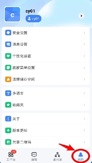 5. 点击右下角的“我的”标签,进入个人设置界面后,即可开展信息修改、语言选择、缓存清理以及版本管理等相关操作。
