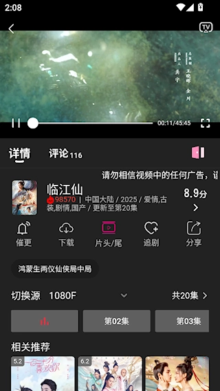 2.多源播放功能:支持最高4K超清画质,可根据网络状况自动适配调节清晰度,同时提供多个播放源自由切换,确保观看过程流畅稳定。