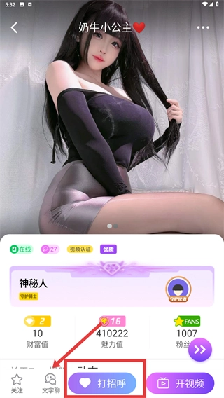 2、进入【奶牛小公主】的主页后,点击【打招呼】按钮,就能快速发起和该用户的互动交流。