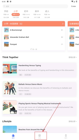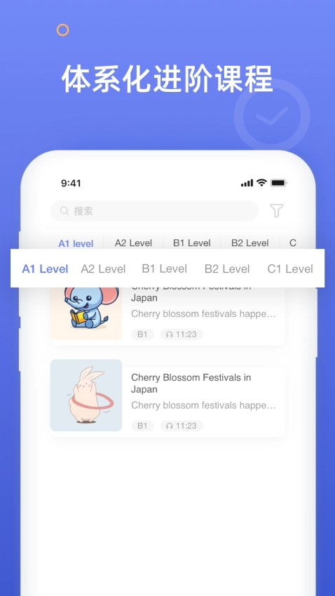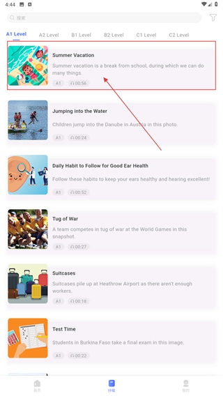 1、在首页点击底部的【分级】选项,就能进入按语言水平分类的课程列表页面,在这里可以选择适合对应难度的学习内容。