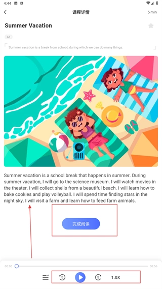 在课程详情页面,能够播放音频、调节语速,阅读完内容后点击【完成阅读】按钮即可标记学习进度。