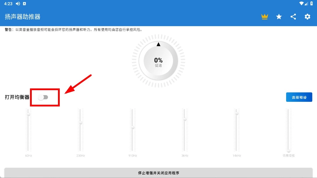 1、点击【打开均衡器-开关按钮】,开启均衡器功能。