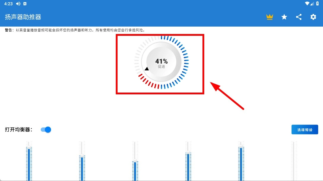 拖动音量增强旋钮,可调整音量的增强程度,例如将其调整至41。