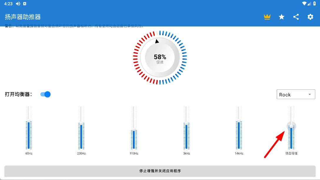 3、支持调节不同频率对应的音量滑块,例如低音增强滑块,以此优化音频播放效果;同时也能选择预设的音效模式,像Rock模式这类选项。