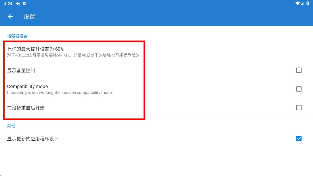 4、进入设置界面后,能够对增强器的各项设置进行调整,比如允许的最大提升幅度、是否显示音量控制、兼容性模式的开启与关闭、设备重启后是否自动启动等选项。