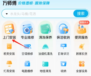 1. 万师傅首页提供上门安装、专业维修、清洗保养等服务,你可以选择所需服务并点击进入。