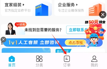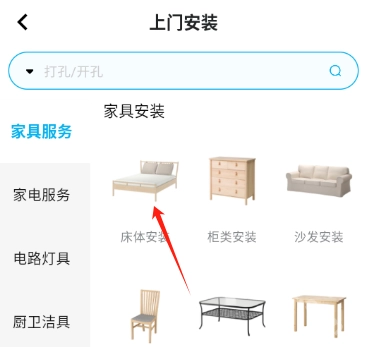 2. 进入后选择具体的服务类目,例如上门安装类下可选择床体安装、沙发安装等具体项目。