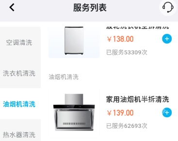 3.家电清洗服务涵盖油烟机、空调、洗衣机、热水器、冰箱、消毒柜、微波炉以及燃气灶等品类。