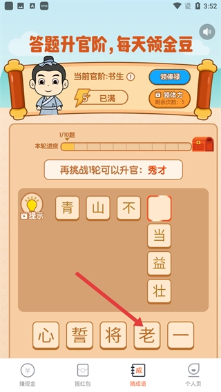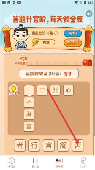 2、进入猜成语的答题界面后,点击对应的汉字,组合成正确的成语,以此完成答题挑战。