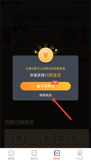 3、答题结束后若弹出奖励窗口,点击【继续挑战】按钮,就能继续参加猜成语答题活动。