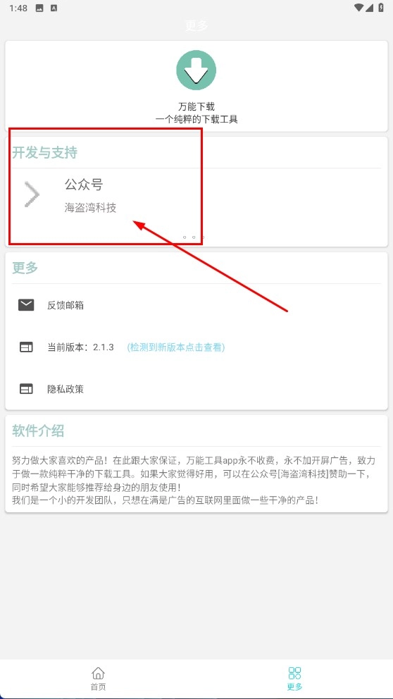 4、进入【更多-界面】后,点击“公众号”选项即可获取开发与支持的相关信息;若有任何问题,也可通过点击反馈功能联系作者。