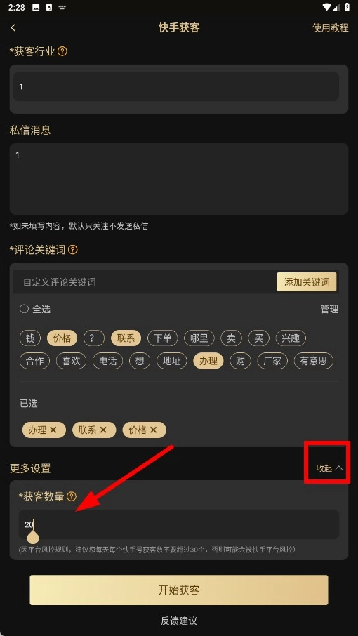 3、打开更多设置选项,填写【获客数量】这一内容,从而完成获客相关参数的设置。