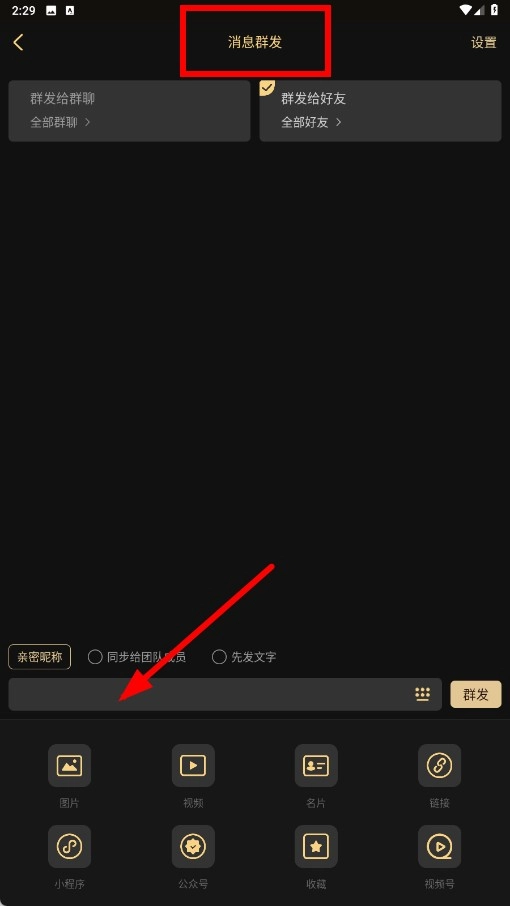 4、进入【消息群发功能页面】,选定群发对象与内容类型后,点击【群发按钮】即可完成消息群发操作。