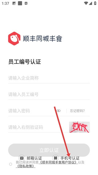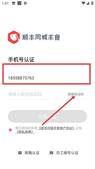 3、进入手机号认证页面后,先输入手机号,接着点击“获取验证码”按钮,同时勾选同意《顺丰同城丰食用户协议》与《隐私政策》。