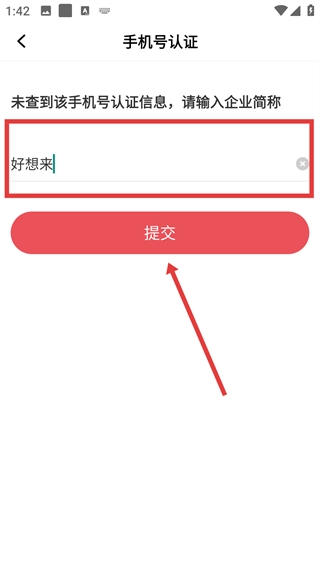 4、若未查到该手机号认证信息,输入企业简称“好想来”,点击“提交”,完成认证流程。