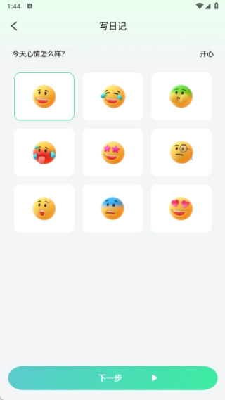 3、在写日记的页面选择心情,接着点击下一步,输入相关信息后进行保存;
