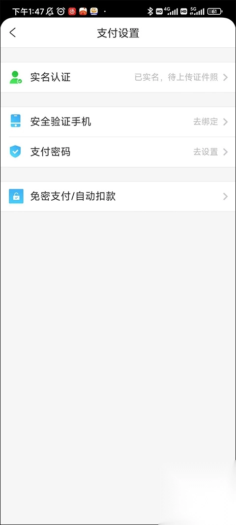 进入支付设置界面后,可以看到实名认证、安全验证手机、支付密码、免密支付/自动扣款这四个功能选项。其中,实名认证是把个人信息与账号进行绑定;安全验证手机则是将用户的手机号关联到账号上,既能提升账号安全性,也方便用户用手机号登录;支付密码的作用是在用户消费时保护财产安全。接下来就是今天教程的重点——免密支付,现在我们点击它。
