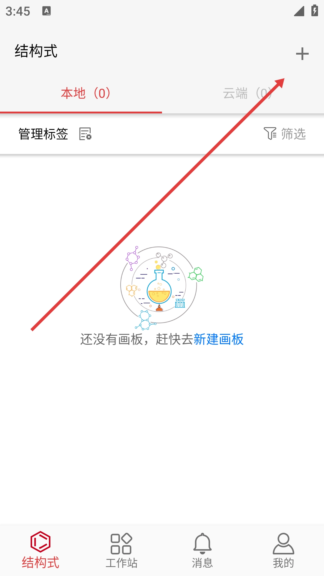1、在结构式界面的右上角找到【+】号并点击,新建一个画板后即可进入结构式编辑页面。