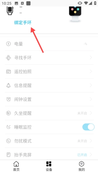 2、进入设备页面后,点击【绑定手环】按钮即可添加个人设备。
