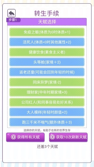 我的一万次初恋游戏是一款以文字为主的模拟养成类游戏,其玩法同网络之前流行的《人生重开模拟器》类似,在此玩家将进入重生轮回,开局挑选转生天赋,进入轮回。当然其中除了天赋,属性点的分配也同样重要,不同属性点的分配对应玩家在轮回中的人生经历,不同选择会影响转生后的人生结局,而以颜值、智力、体能和家境为代表的属性点分配,对应玩家在各种随机事件做出选择后的属性加点,每次选择终会影响剧情的最终结局。