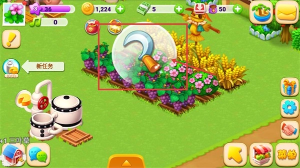 进入场景后,点击被框选的镰刀工具,执行相应操作来获取制作牛奶所需的原料,从而推动任务进展。