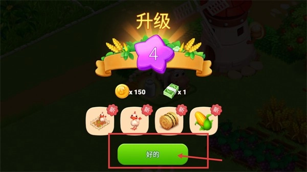 4、在升级界面里,点击被框选的【好的】按钮,确认包括150金币在内的升级奖励,以此继续推进任务来解锁新内容。