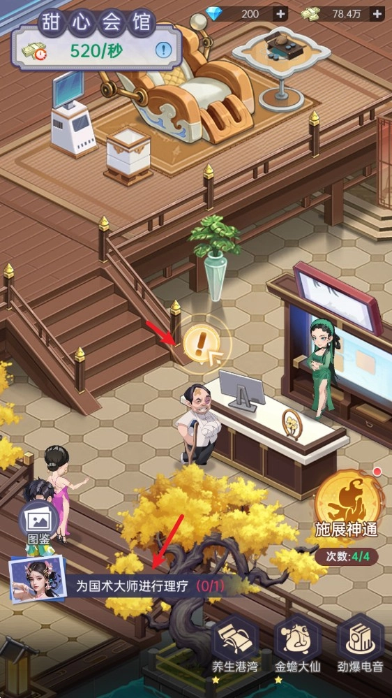 选择下方对应的理疗室即可进行升级,提高收入。