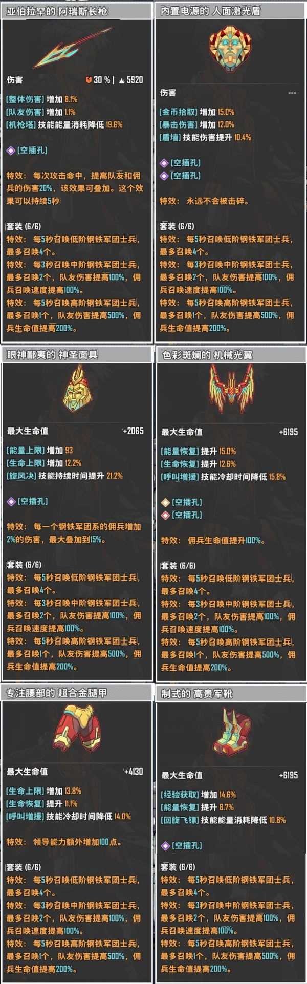 这套装备的特性是每隔数秒就会召唤出不同等级的钢铁军团士兵协助作战。只要你存活,你的部下们就会持续加入战斗。穿戴的件数越多,整套装备的属性效果就越显著!