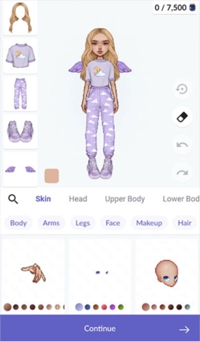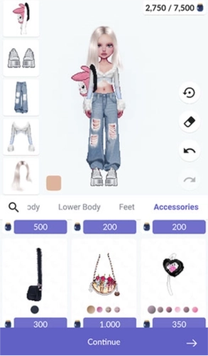 4、还能给你的虚拟形象挑选不同风格的包包,装饰好之后点击底部的【continue】箭头就可以啦!