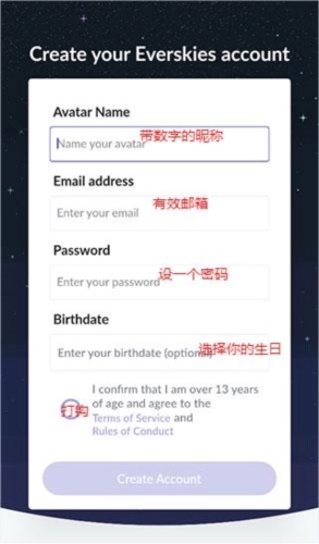 5、在此处进行角色与账号的创建操作,依次填写昵称、有效的电子邮箱、密码、生日等相关信息,勾选对应的协议条款后,点击页面底部的创建按钮即可完成。