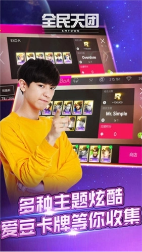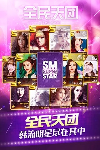 《全民天团》是获得韩国SM娱乐有限公司正版授权开发的音乐游戏,其英文原名为“SUPERSTAR SMTOWN”。作为SuperStar系列中的经典之作,这款游戏玩法十分丰富:玩家能够通过收集卡牌来解锁心仪明星的歌曲,之后还可以选择PK对战或闯关模式进行音乐弹奏,带来别具一格的游戏体验。游戏内收录了大量耳熟能详的热门金曲,同时包含EXO、TVXQ!、Super Junior、少女时代(Girls’ Generation)、SHINee、BoA等超人气艺人的卡牌,总数超过2000张,堪称自带BGM的追星必备神器!