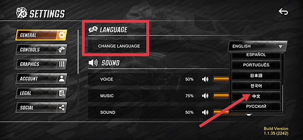 接着再去选择language右侧的语言栏,看到中文选项后,直接切换即可。