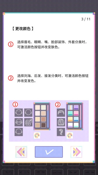 在选择眉毛、眼睛、嘴、脸部装饰、外套这些分类时,能够激活颜色按钮从而改变肤色。