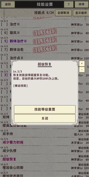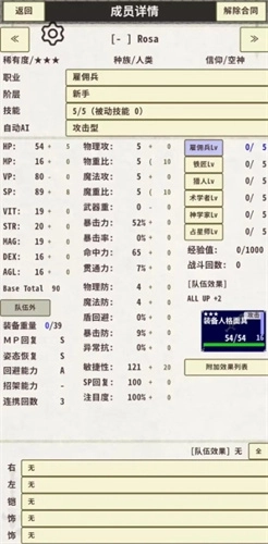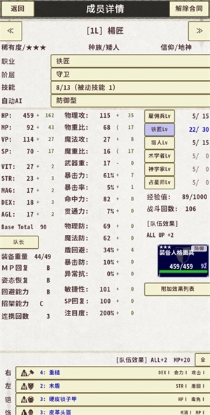 技能:最多8个主动技能,被动技能不占用8个技能数,灰色技能无法使用,因为技能有使用前提,例如装备具有斩击,打击属性武器等前提条件,所以灰色技能不要选。中间左边的队长表明此人是队伍队长,也可选择其他为队长,在其他人同样位置点击成员即可更换,选择带有队伍效果的成员为队长,能提供加成。