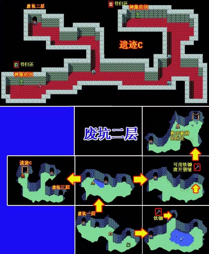 在一层和二层的右侧能够找到[マトック铁锄],用它敲碎一处有裂缝的墙壁,就能解救出受困的医生。三层右侧可以找到[フアイヤヘのまほう火焰杖],将其装备后就能发射火弹(部分敌人只有通过魔法攻击才能对其生效)。而在左侧的遗迹中,则能找到[ワレリアのゆびれ项链]。